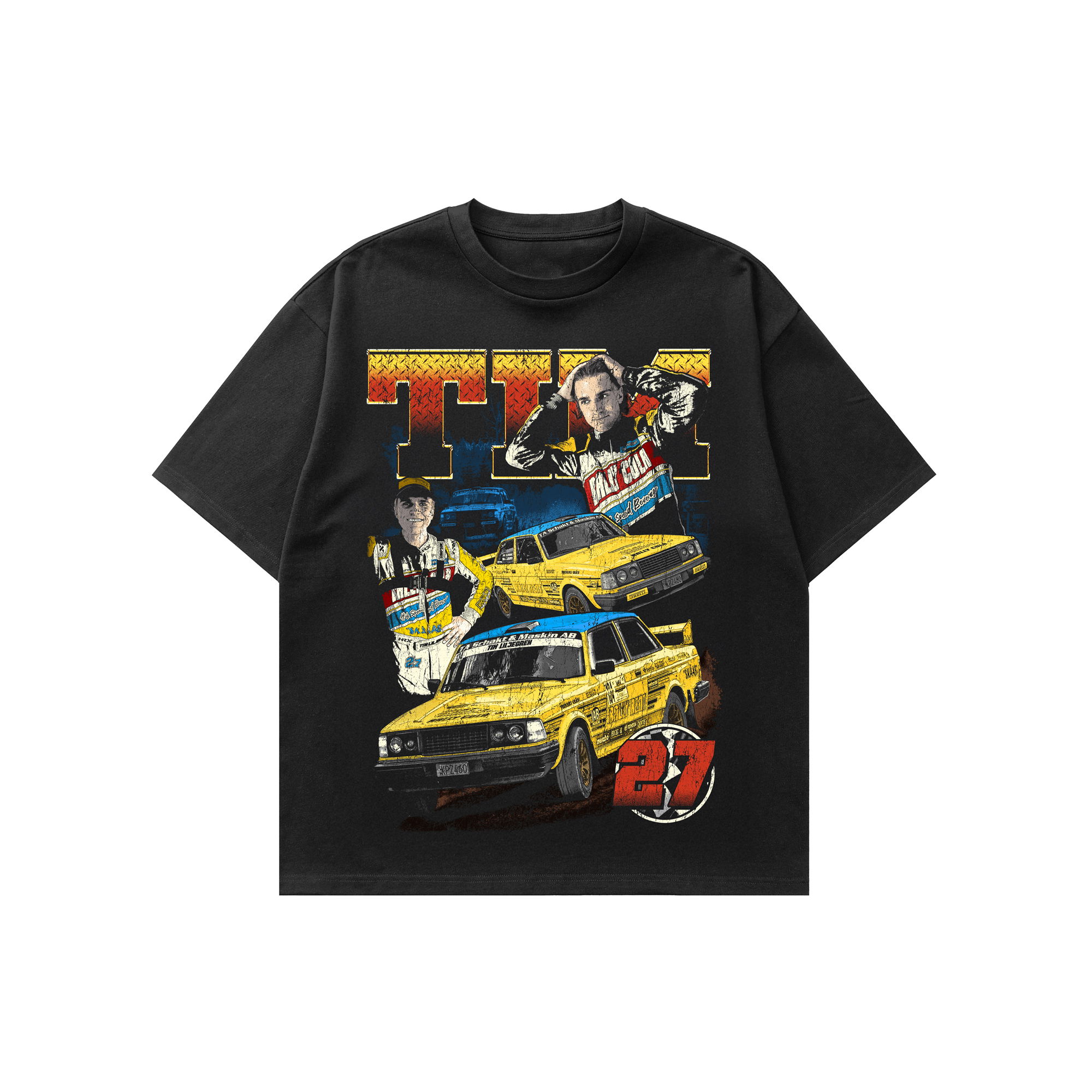 Denna t-shirt i vintage-look bär en design med Tim Liljegren i fokus, tillsammans med hans klassiska gula Volvo 240 – känd från rallyskogen och sociala medier. Trycket är slitet för att ge en autentisk retrokänsla, med starka färger och detaljer.