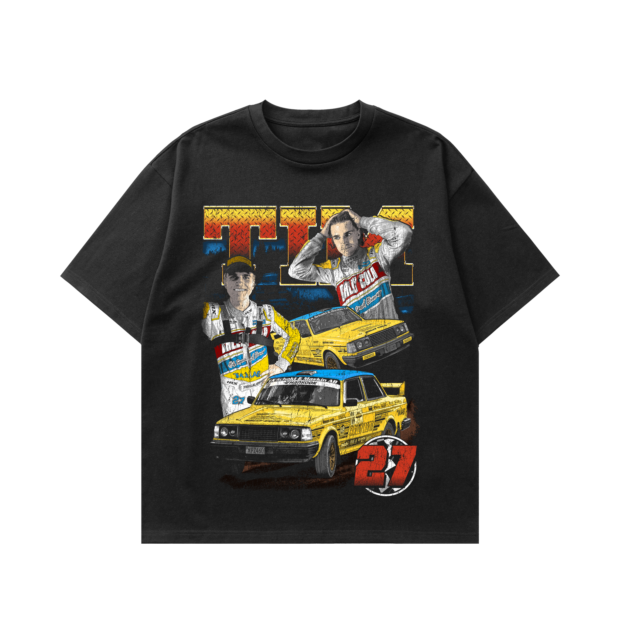 Denna t-shirt i vintage-look bär en design med Tim Liljegren i fokus, tillsammans med hans klassiska gula Volvo 240 – känd från rallyskogen och sociala medier. Trycket är slitet för att ge en autentisk retrokänsla, med starka färger och detaljer.