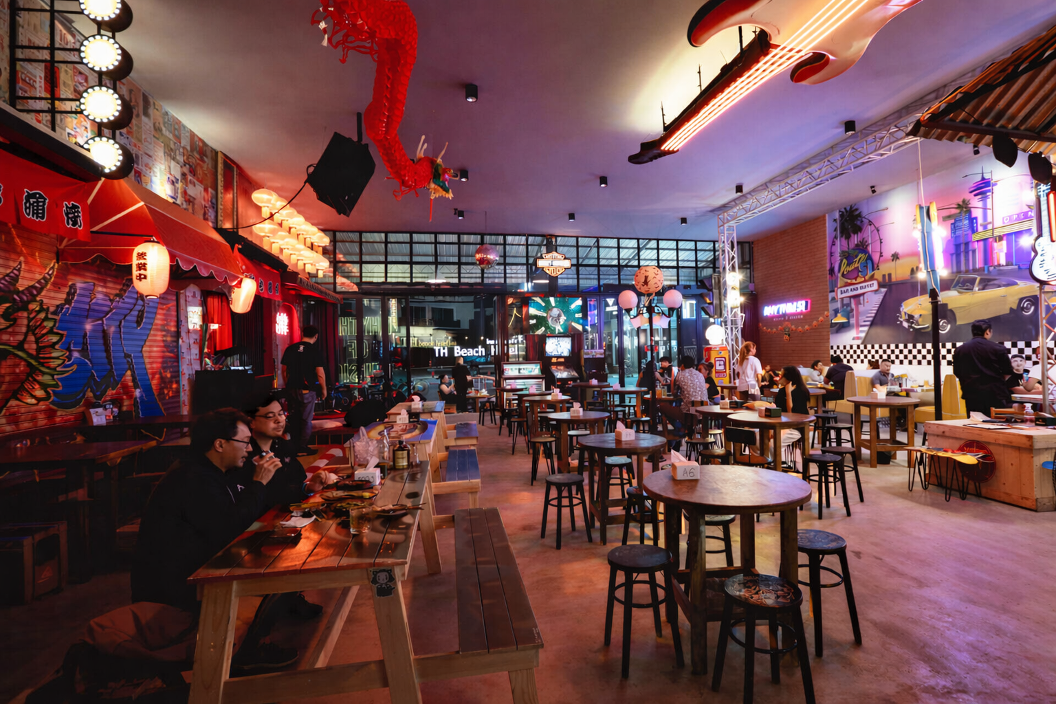 Inredningen är en skön mix mellan amerikanskt 50-talsdiner, kinesiska detaljer och färgstark graffiti – en oväntad men klockren kombination.