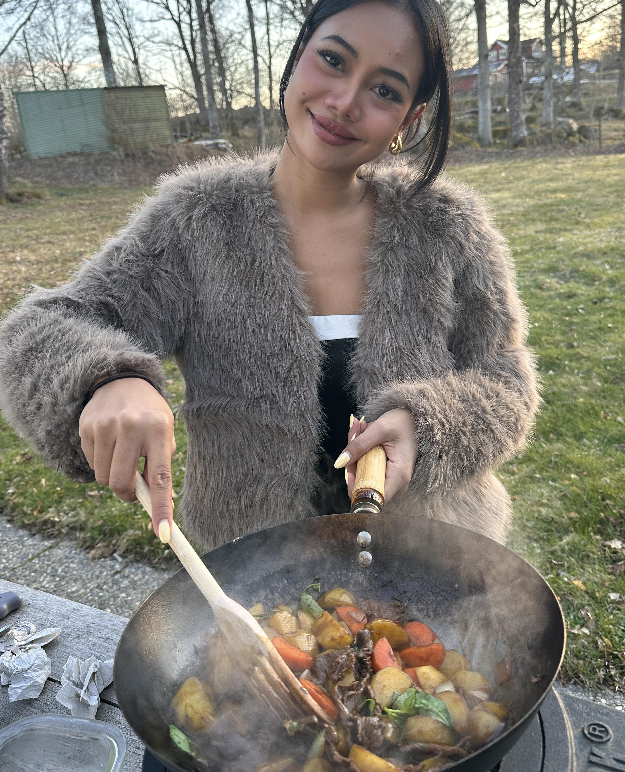 Skär nötköttet i tunna skivor eller strimlor. Blanda sedan köttet med två matskedar Tims Sås.